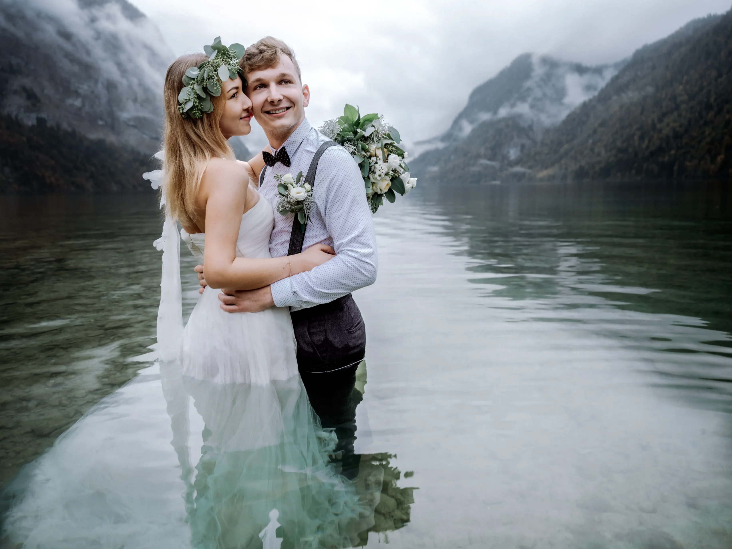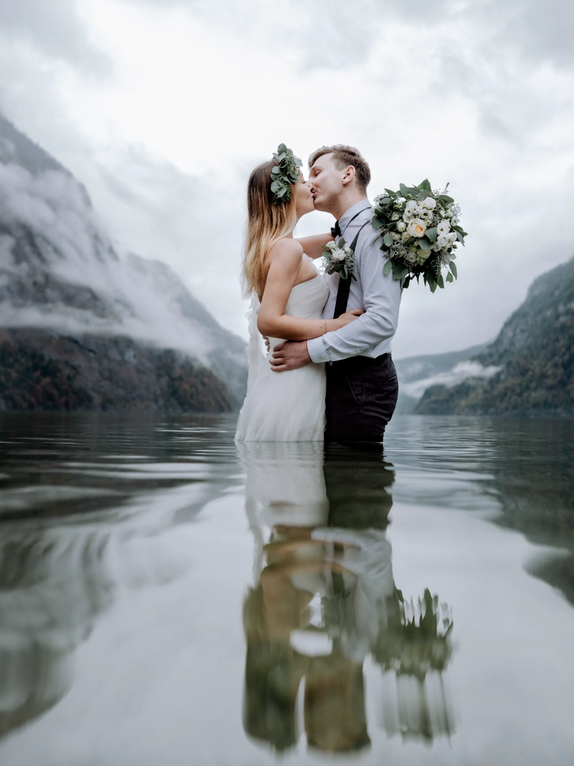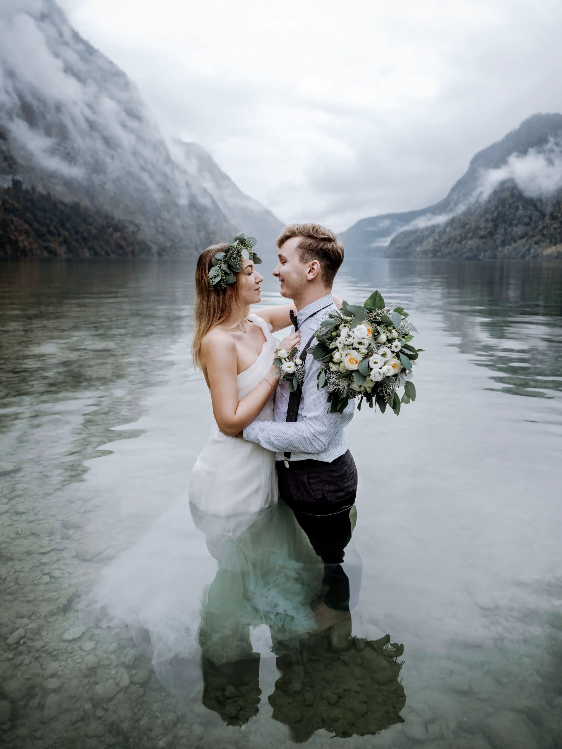 Nach dem Abstieg zurück zum Königssee war unser Abenteuer noch nicht beendet. Wir wollten noch Fotos im See selbst machen, der zu dieser Zeit eine Temperatur von etwa 7 Grad hatte. Trotz der Kälte waren Julian und Lisa begeistert und mutig genug, ins Wasser zu gehen. Die Fotos, die dabei entstanden, sind einzigartig und strahlen die Frische und Leidenschaft des Paares aus.